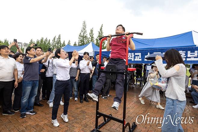 | ▲ 김문수 국민의힘 대선 후보가 28일 경북 경산시 영남대학교를 방문해 축제 현장에서 턱걸이를 하고 있다. |