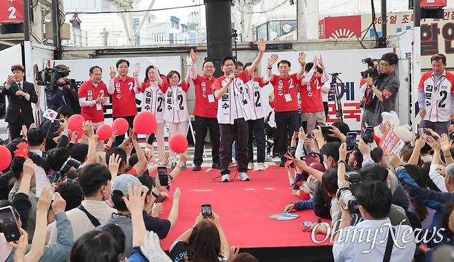 손발이 안 맞았다. 후보는 다음날부터 이틀간 실시되는 사전투표에 참여하라고 독려했는데, 유세장에 모인 지지자들은 큰 소리로 "6월 3일"이라거나 "본투표", "당일 투표" 등을 외쳤다.