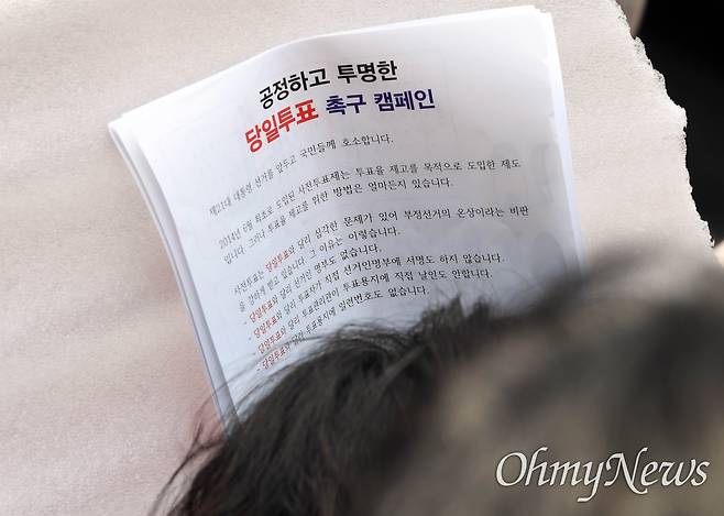 | ▲ 28일 부산 서면 쥬디스태화 백화점 앞에서 열린 김문수 국민의힘 대선 후보 유세에서 한 시민이 '당일투표 촉구 캠페인' 인쇄물을 들고 있다. |