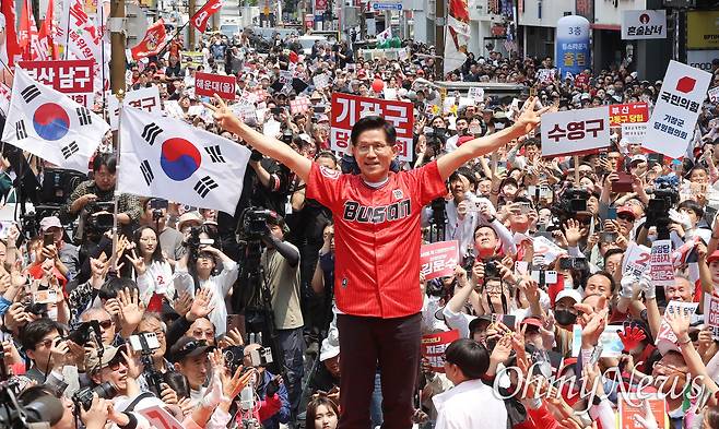 | ▲ 롯데 자이언츠 유니폼 입고 부산 유세 나선 김문수 김문수 국민의힘 대선 후보가 28일 오후 부산 서면 쥬디스 태화 백화점 앞에서 열린 "필승으로 이어질, 부산의 함성" 집중유세에서 유권자들에게 지지를 호소하고 있다. |