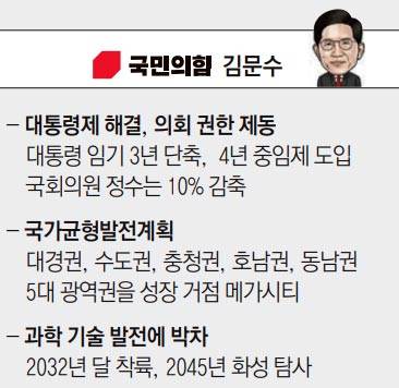 공약집엔 제왕적 대통령제를 해결하고 과도한 의회 권한에 제동을 거는 내용이 포함됐다. 김 후보는 대통령 임기 3년 단축을 추진하고 4년 중임제 도입을 위해 2028년 대선과 총선을 동시에 치르겠다고 약속했다. 대통령 불소추특권과 국회의원 불체포 면책 특권도 폐지하기로 했다. 국회의원 정수는 10% 감축하겠다는 방침이다.