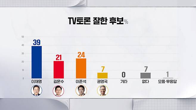 시청했단 사람들에게 누가 TV 토론을 가장 잘했다고 생각하는지 추가로 물었더니, 이재명 39%, 김문수 21%, 이준석 24%, 권영국 7%로 조사됐습니다.