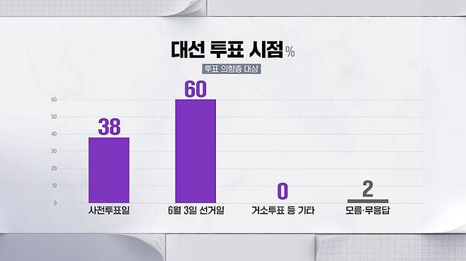 투표 의향자들에게 사전투표와 본투표 가운데 언제 하겠느냐고 다시 물었더니, 38%는 내일부터 모레 이뤄지는 사전투표일에, 60%는 6월 3일에 투표하겠다고 답했습니다.