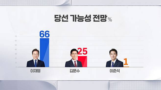 이재명 후보 66%, 김문수 후보 25%, 이준석 후보 1%로 나타났습니다.