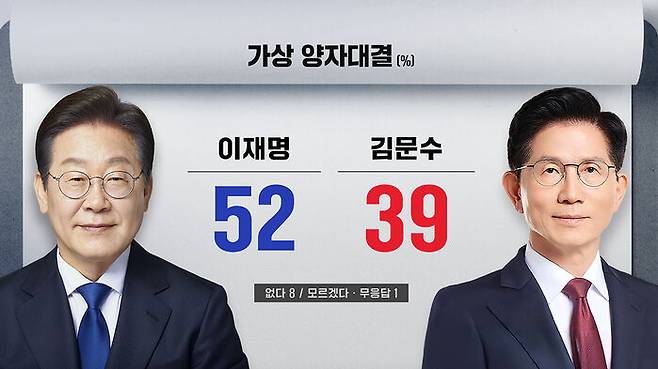 이재명, 김문수 후보의 가상 양자 대결에선 이재명 52%, 김문수 39%로 이재명 후보가 오차 범위 밖에서 우위를 보였습니다.
