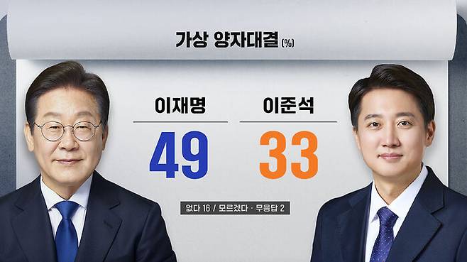 이재명, 이준석 후보의 가상 양자 대결에선 이재명 49%, 이준석 33%로 이재명 후보가 오차 범위를 넘어 앞섰습니다.