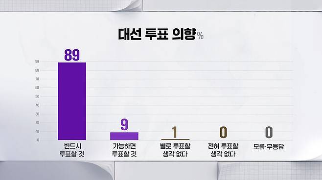 이번 6월 3일 대선에 투표할 거냐는 질문에 응답자의 89%는 반드시 투표하겠다고, 9%는 가능하면 투표하겠다고 답해, 전체 응답자의 98%가 투표하겠다고 밝혔습니다.