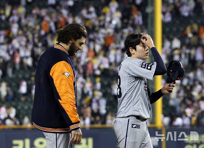 [서울=뉴시스] 김명년 기자 = 28일 서울 송파구 잠실야구장에서 열린 2025 KBO리그 한화 이글스와 LG 트윈스의 경기, 6-5로 경기를 이긴 한화 폰세와 조동욱이 코치진과 인사하기 위해 이동하고 있다. 2025.05.28. kmn@newsis.com