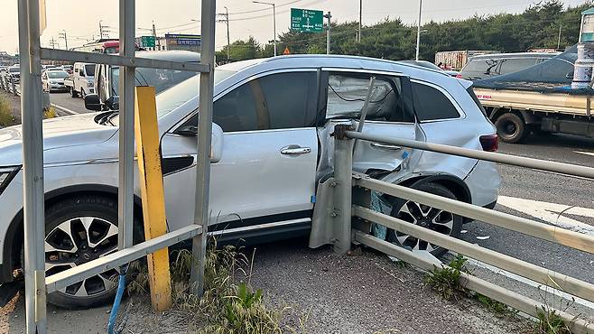 오늘 오후 5시 반쯤 경기 김포시 통진읍의 하성입구삼거리 근처 도로에서 승합차가 가드레일과 SUV 차량을 잇따라 들이받았습니다.
