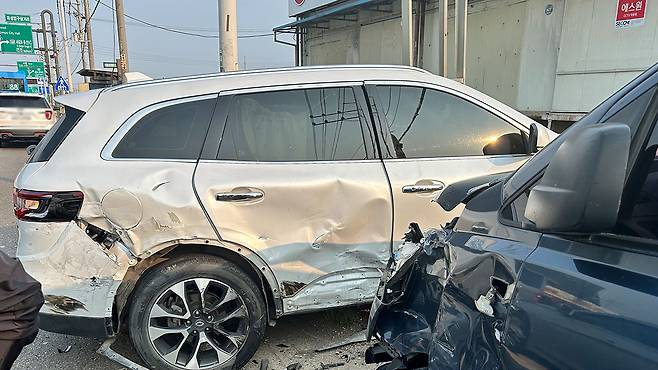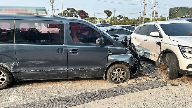 오늘 오후 5시 반쯤 경기 김포시 통진읍의 하성입구삼거리 근처 도로에서 승합차가 가드레일과 SUV 차량을 잇따라 들이받았습니다.