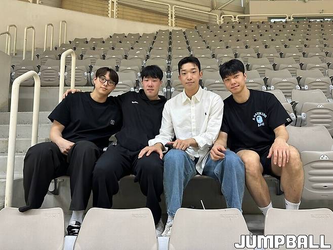 28일 고려대학교 화정체육관에서 열린 2025 KUSF 대학농구 U-리그 고려대와 동국대와 경기. 고려대 출신 선수들이 경기장을 방문했다. 신주영(대구 한국가스공사), 박준형(울산 현대모비스), 김재현(수원 KT), 김태훈(서울 SK)이 그들.