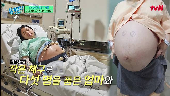 사공혜란 씨는 "배가 불러오는 속도가 너무 빠르니까 자고 일어나면 배가 나와 있더라. 다섯 명이 한 번에 크니까 (위가 눌려서) 먹으면 토했다. 23주 넘어가서는 걸을 수도 없었다"라고 회상했다.