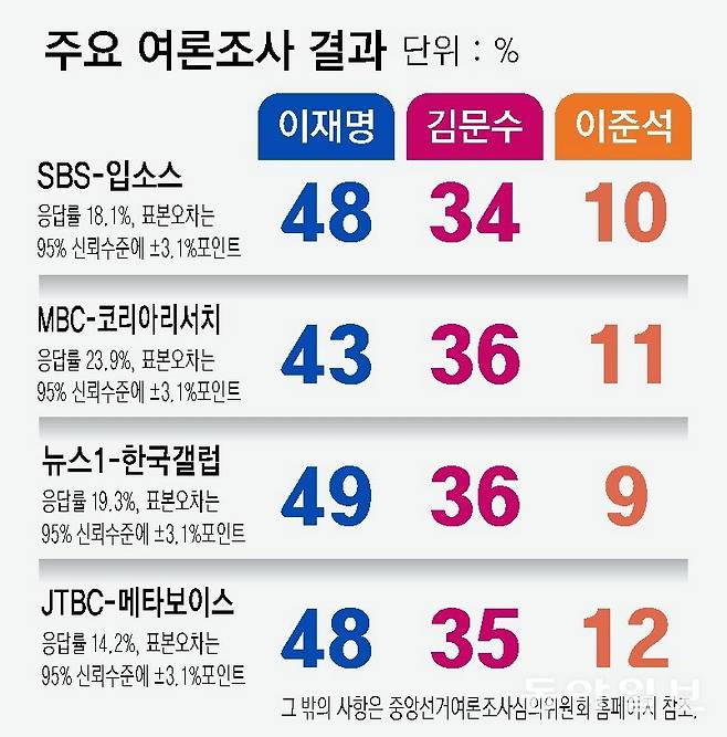 28일 KBS가 한국리서치에 의뢰한 여론조사(25~27일 전국 1000명을 무선전화면접 100% 방식으로 조사)에서는 이재명 후보의 지지율은 45%였다. 이어 김 후보 36%, 이준석 후보 10%라고 응답했다. 중도층에선 이재명 후보 46%, 김 후보 25%, 이준석 후보는 17%였다.