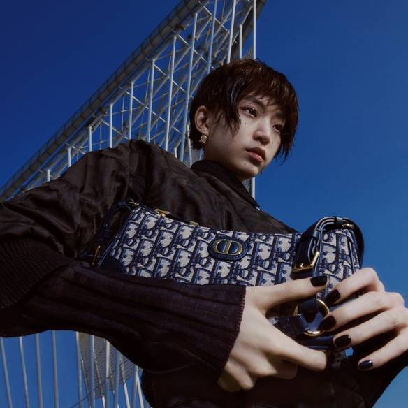크롭트 집업 재킷과 시스루 톱, 스커트처럼 연출이 가능한 랩 버뮤다 팬츠, 벚꽃 모티프의 이어링, 블루 오블리크 자카르가 특징인 30 몽테인 원더러스트 미니 백은 모두 Dior.