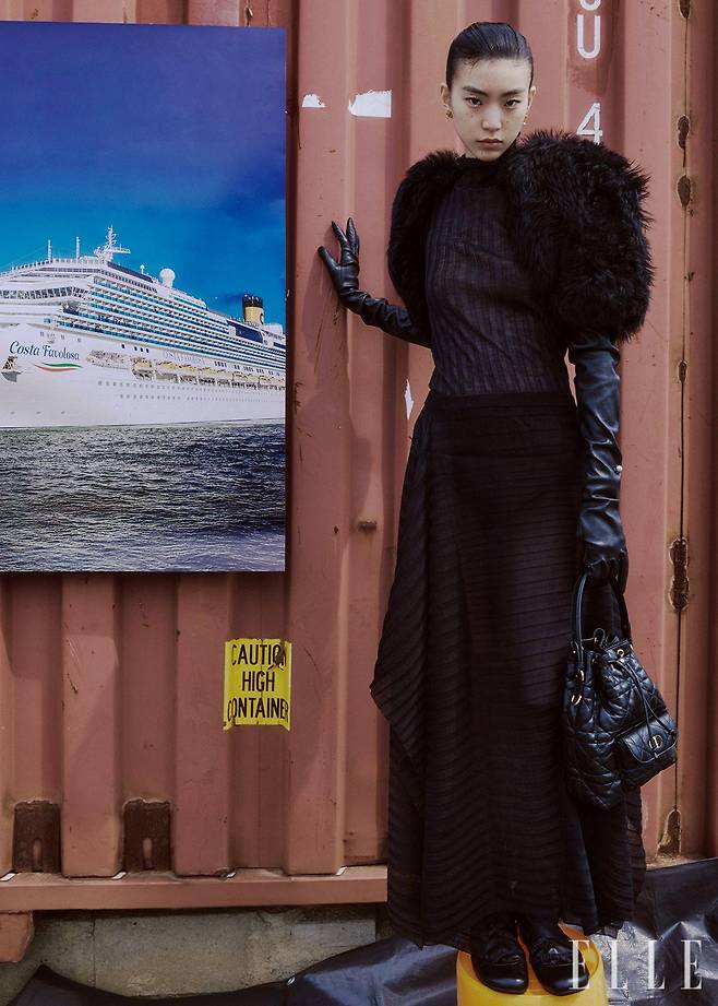 레더 글러브가 부착된 퍼 재킷과 시스루 톱, 스커트, 사이하이 부츠, 플라워 모티프의 이어링, 카나주 스티치로 장식한 카로 버킷 백은 모두 Dior.