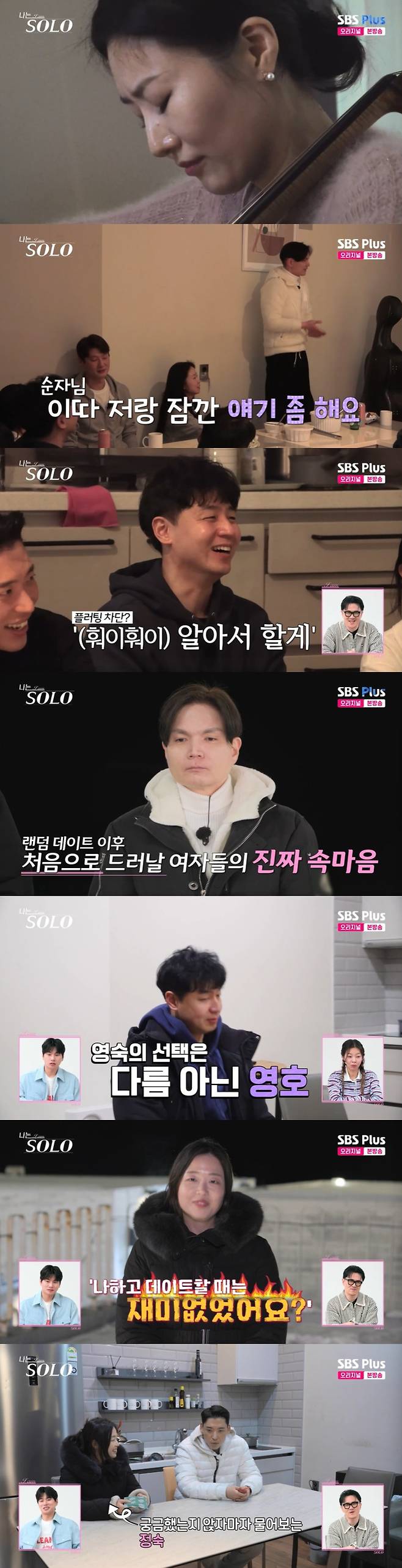 이어 정숙은 상철을 찾아갔다. 이에 정숙을 원했던 상철은 "감사합니다"라며 인사를 건넸고, 정숙은 "랜덤 데이트 때 같이 나가셨던 영숙 님이 상철 님이 되게 말을 많이 하셨다더라. 저하고 데이트할 때는 수줍으셔서 그런 건지 알 수 없지만 그렇게 모터 달린 듯이 말하진 않은 것 같다"며 "'나하고 데이트할 때는 재미없었어요?' 이런 거 물어보고 싶었다"라고 속마음을 내비쳤다.