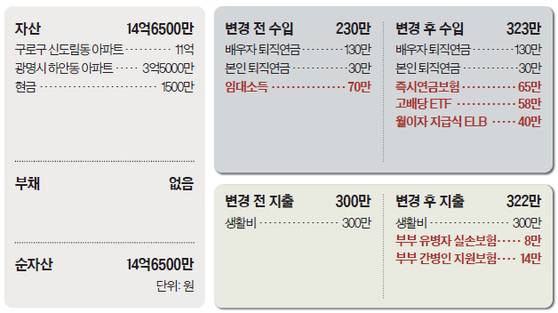 Q. 서울 구로구에 사는 70대 초반 유모씨는 퇴직한 남편과 단둘이 사는 전업주부다. 유씨의 자산 대부분은 부동산에 집중돼 있다. 실거주 중인 아파트 외에 지난 2018년 경기도 광명에 상속받은 아파트 한 채 더 있는데, 월세 70만원을 받고 있다. 다만 물가 상승과 의료비 등 예기치 못한 지출 증가를 생각하면 생활비가 빠듯하다. 이에 양도소득세 부담을 감수하고 해당 아파트를 처분해 수익형 소형 오피스텔 두 채를 구매하는 방안을 고민 중이다. 부동산 갈아타기 등으로 마련된 현금은 안정적인 수익을 올릴 수 있는 투자 포트폴리오로 구성하고 싶다.