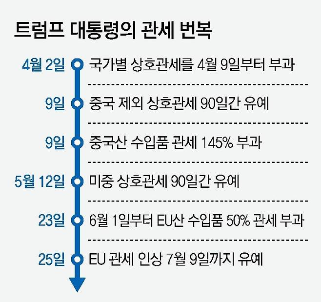 앞서 23일 트럼프 대통령은 EU와의 협상 진전이 없다면서 다음 달 1일부터 EU를 대상으로 50% 관세를 부과할 수 있다고 으름장을 놨다. 이 때문에 23일 다우존스지수, S&P500지수는 일제히 하락세를 그렸다. 그랬던 트럼프 대통령이 25일 EU에 대한 관세 부과를 7월 9일까지 유예한다고 밝히자 위험자산 선호 심리가 되살아났다. 26일은 ‘메모리얼 데이’로 인한 뉴욕 증시 휴장일로, 27일이 EU 관세 유예 이후 첫 거래일이었다.