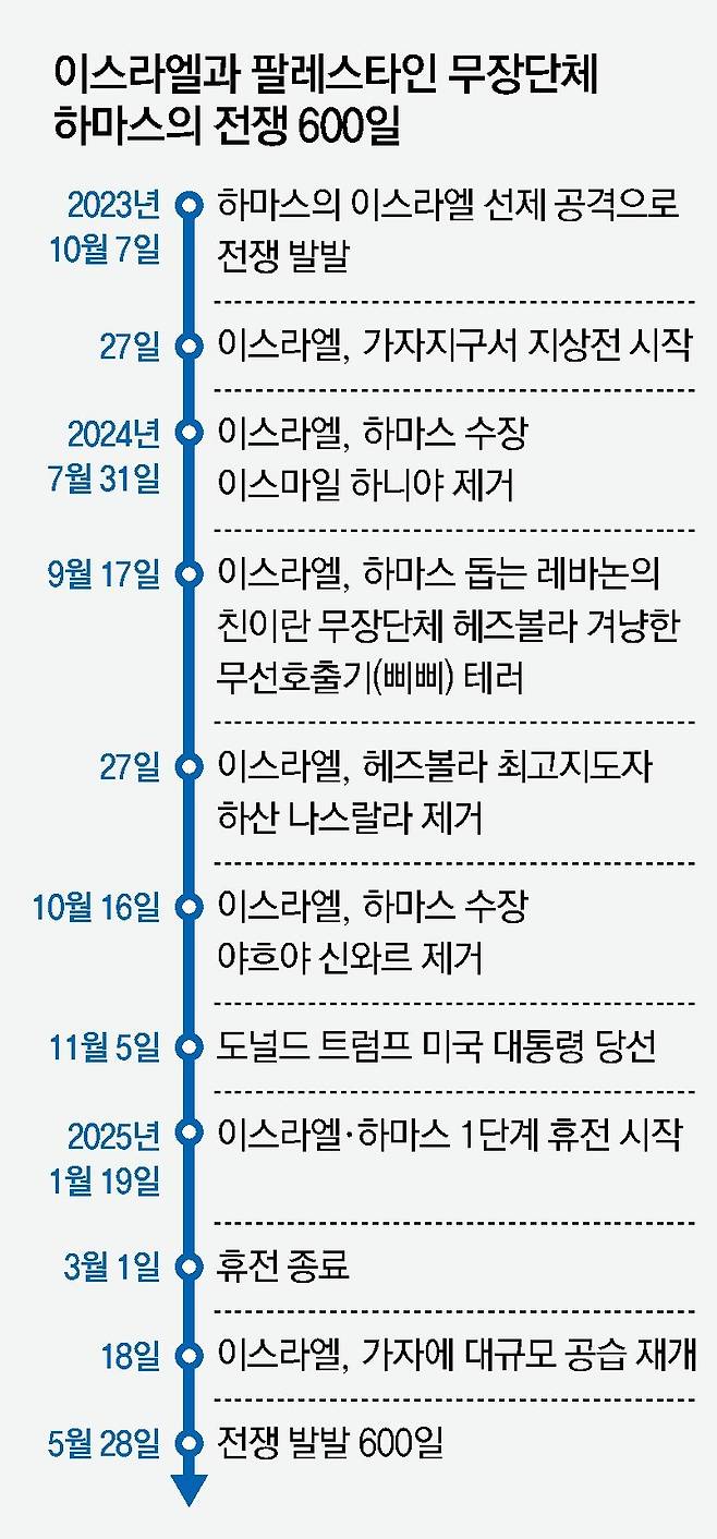 양측은 앞으로도 극한 대립을 이어갈 가능성이 높다. 전쟁 발발 뒤 이스라엘에서는 베냐민 네타냐후 총리를 포함한 극우 강경파가 정국을 주도하고 있다. ‘중재자’를 자처했던 도널드 트럼프 미국 대통령도 최근에는 관세 전쟁, 중국과의 패권 갈등, 반(反)이민 등을 우선하는 모양새다.