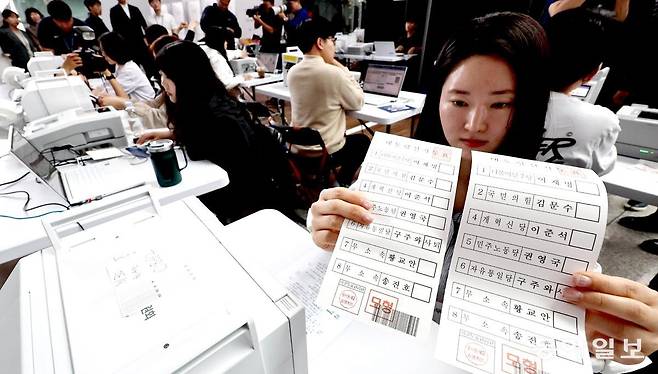 | 오늘 오전 6시부터 사전투표 28일 인천국제공항 제1터미널 출국장에 마련된 운서동 제2사전투표소에서 관계자가 모의 사전투표에서 사용된 투표용지를 검토하고 있다. 사전투표는 29, 30일 이틀간 매일 오전 6시부터 오후 6시까지 전국에 설치된 사전투표소 어디에서나 할 수 있다. 인천=양회성 기자 yohan@donga.com |