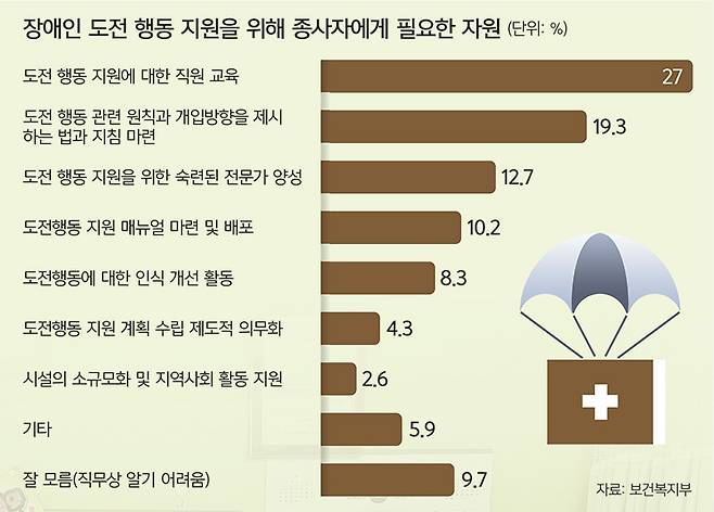 일부 발달장애인의 공격적 행동 특성으로 생활지도원의 몸에 크고 작은 상처가 생긴다. 생활지도원 임지혜(37)씨는 “손에 생채기가 많다. 거주인들이 긁어서 난 것들”이라면서 “갑자기 손이 훅 다가와 머리채를 잡거나 발로 차이기도 한다. 거주인이 도전적 행동을 했을 때 익숙해지기보다 ‘내가 왜 이러고 있지’라는 회의감이 든다”고 말했다.