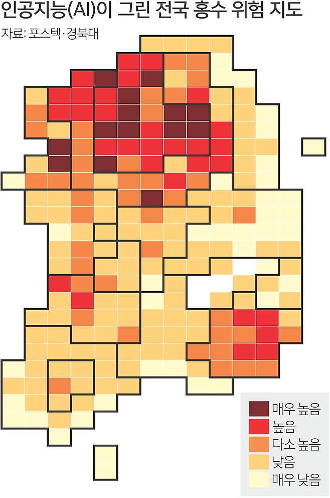 연구진은 인공지능(AI)을 활용해 이를 해결했다. 행정안전부가 파악한 최근 20년간(2002~2021년) 전국 시·군·구별 홍수 피해 데이터를 분석한 뒤 홍수 위험을 결정하는 △위해성(비가 얼마나 많이 오는지) △노출성(위험에 노출된 인구와 시설) △취약성(피해를 받기 쉬운 정도) △대응력(얼마나 잘 대처할 수 있는지)을 세분화해 이를 AI에 학습시켰다.