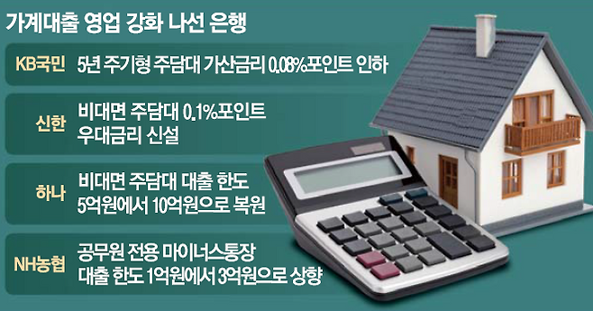 KB국민은행은 최근 5년 주기형 주담대에 적용되는 가산금리를 0.08%포인트 내렸다. 신한은행은 이달 중순부터 비대면 주담대와 전세대출에 우대금리 0.1%포인트를 적용하고 있다.