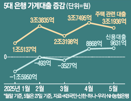 현재 5대 은행의 주택 관련 대출 잔액은 592조6236억원인데 현재 속도라면 수개월 내 600조원을 돌파할 것으로 관측된다. 아울러 한동안 감소세였던 신용대출 잔액도 증가세로 반전했다. 5대 은행 신용대출 잔액은 올해 들어 3월까지 매달 줄어들었는데 4월 8868억원에 이어 이달 9631억원이나 불었다.