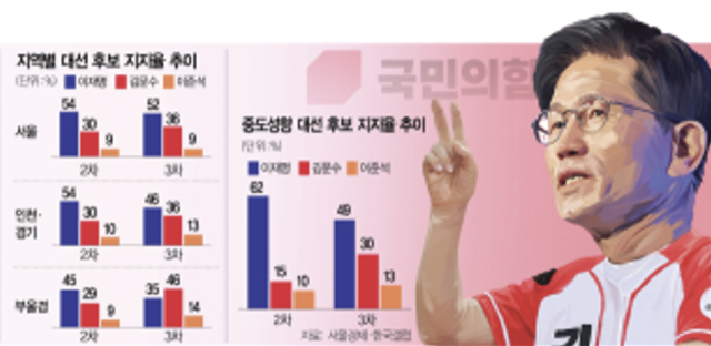 중도층의 변화도 확연했다. 2차 조사에서 62%였던 이재명 후보에 대한 중도층의 지지율이 이번 조사에서는 49%로 쪼그라든 반면 김 후보에 대한 지지율은 15%에서 30%로 뛰었다. 이규정 고려대 연구교수는 “국민의힘이 이준석 후보와의 단일화 이슈를 꺼내 들면서 선거 프레임이 단일화로 전이됐고 언론 보도가 단일화에 치중되면서 선거 원인이 됐던 12·3 비상계엄 이슈는 크게 줄어들었다”며 “그 결과 이재명 후보 지지자인 진보층이 이완된 경향이 나타났다”고 해석했다. 이 교수는 “김문수·이준석 네거티브 협공도 적지 않은 영향을 미쳤다”면서도 “판세가 변한 건 없다”고 덧붙였다.