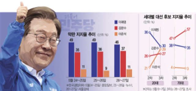 6·3 대선 여론조사 공표 금지(대선 6일 전, 5월 28일부터)를 앞두고 실시된 여론조사에서 이재명 더불어민주당 후보의 기세가 주춤하고 있다. 50% 지지율로 고공행진을 이어가며 김문수 국민의힘 후보를 20%포인트가량 따돌렸던 격차는 한 자릿수로 줄어들었고 이준석 개혁신당 후보 지지율은 10%대에 안착했다.