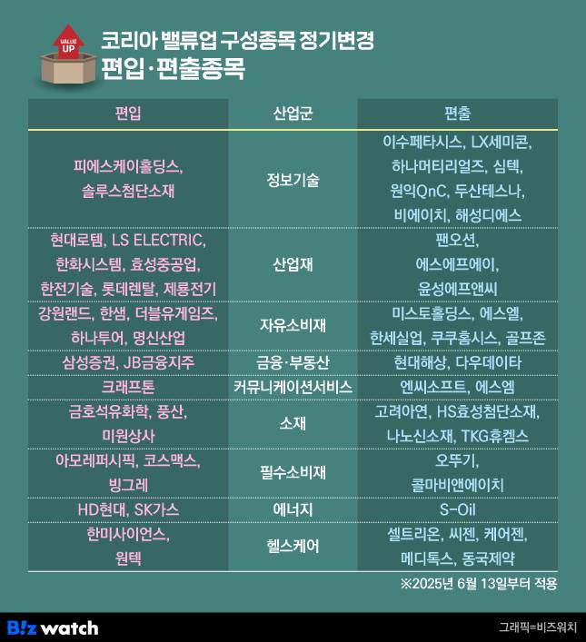 같은날 코스피200에서 8개 종목이 각각 편입·편출되고, 코스닥150에서 각 9개 종목이 편입·편출된 것과 비교하면 대대적인 물갈이다.밸류업 역행 대표사례로 꼽힌 '고려아연'과 '이수페타시스'