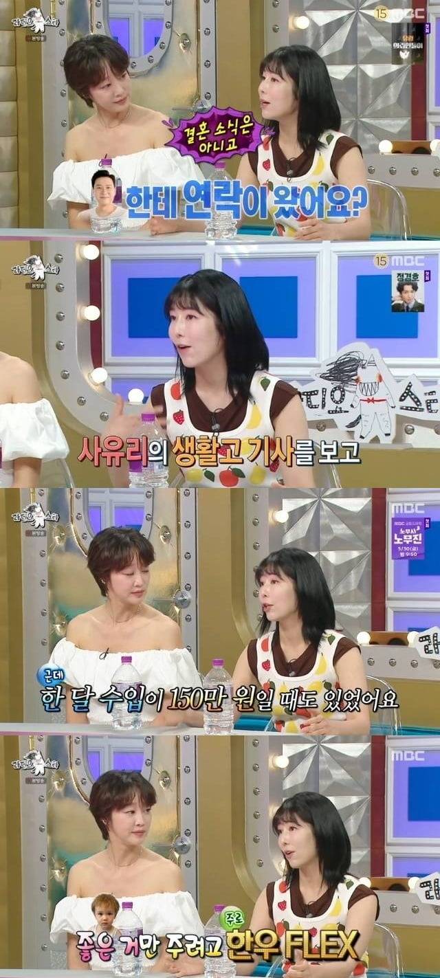 최근 '동치미'에 출연해 "생활고를 겪었다. 고정 프로그램이 없어서 한 달에 150만원 벌 때가 있다"고 고백했던 사유리. 근황을 묻자 그는 "괜찮아졌다"고 답했다. 10년 연예계 생활하며 번 돈 있지 않냐는 말에는 "그렇다"면서도 "아기는 좋은 거만 주고 싶어서 한우를 사준다. 젠에 한우를 사주기 위해 텀블링 학원도 끊고, 택시도 끊었다. 버스 타고 다닌다"고 고백했다.