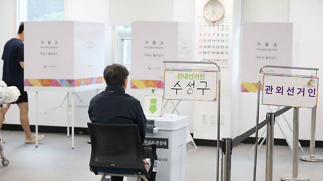 투표 사무원들은 차분한 분위기 속 유권자에게 관내·관외 선거인 유무를 묻고 투표 방법 등을 안내했습니다.