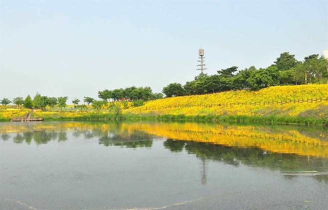 요즘, 길가에 샛노랗게 핀 금계국이 하늘거리는 풍경을 쉽게 볼 수 있다. 금계국을 보러 함안에 있는 악양생태공원에 갔다. 남강변에 26만 5천 m²의 규모로 조성된 공원에는 계절 따라 봄에는 꽃양귀비와 샤스타데이지, 초여름에는 금계국, 그리고 가을에는 핑크뮬리와 버들마편초가 꽃을 피운다.