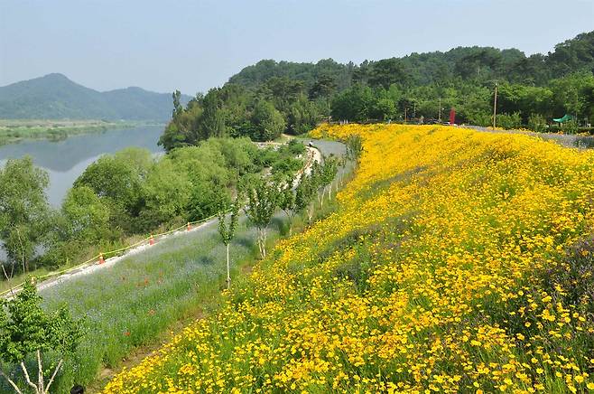 악양생태공원 둑방길 언덕은 온통 노랗게 변해 있었다. 양쪽에 수레국화가 피어있는 둑방길을 걸었다. 햇살처럼 밝은 노란색으로 활짝 핀 금계국은 보고만 있어도 마음이 절로 환하게 밝아지는 것 같다.