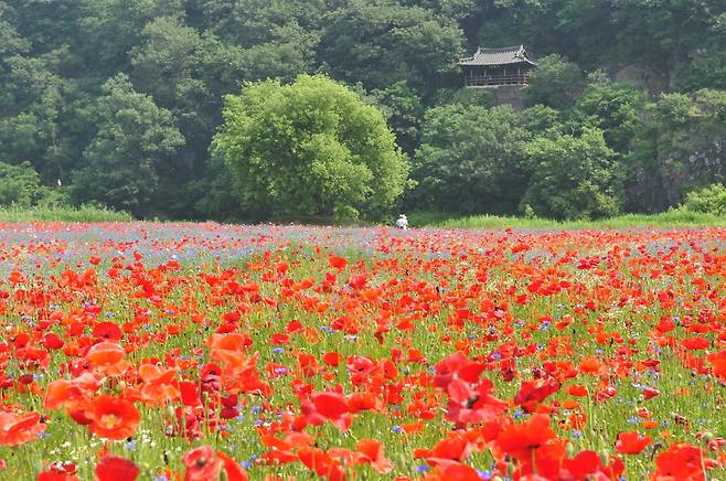 | ▲ 꽃양귀비가 핀 둑방길을 걷고 있는 사람들. |