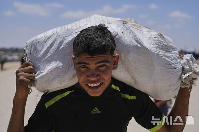 [칸유니스=AP/뉴시스] 28일(현지 시간) 한 팔레스타인 청소년이 가자지구 라파에서 미국이 주도하는 가자 인도주의 재단으로부터 식량과 물품을 받아 들고 칸유니스로 돌아오면서 밝은 표정을 짓고 있다. 2025.05.29.