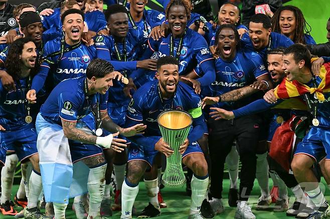 (브로츠와프 AFP=뉴스1) 우동명 기자 = 첼시 선수들이 28일(현지시간) 폴란드 브로츠와프의 브로츠와프 스타디온에서 열린 UEFA 콘퍼런스 리그(UECL) 결승서 후반전에만 4골을 폭발하며 레알 베티스를 꺾고 대회 첫 우승으로 UEFA 주관 대회 첫 그랜드슬램 달성을 기뻐하고 있다. 2025.05.29
