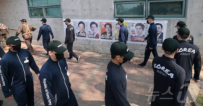 (논산=뉴스1) 김기태 기자 = 제21대 대통령 선거 사전 투표 첫날인 29일 오전 충남 논산 연무문화체육센터에 마련된 연무읍 제2사전투표소에서 육군훈련소 장병들이 투표를 하기위해 투표장을 향하고 있다. 2025.5.29/뉴스1