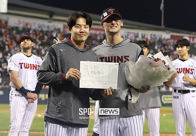 경기 종료 후 작별식 마련한 LG, 임찬규에게 기록지 선물 받은 '호주 임찬규' 코엔 윈