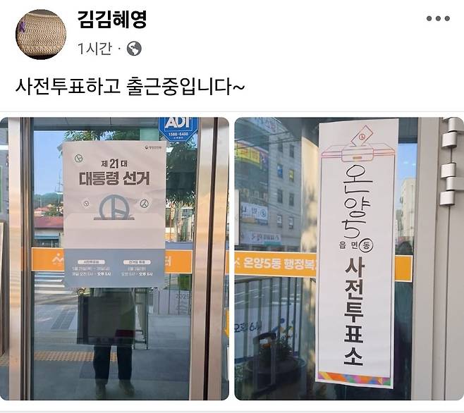 김혜영 전 충남인권센터장도 이날 출근길에 사전투표를 마치고 페이스북에 인증 사진을 올렸다.