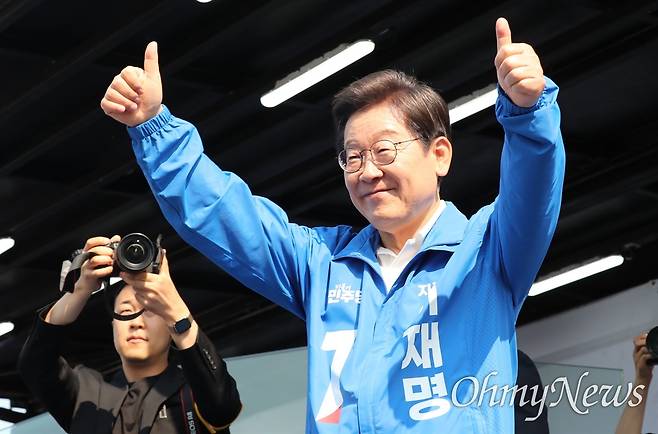 | ▲ 이재명 더불어민주당 대선 후보가 25일 충남 당진시 당진전통시장 입구에서 지지를 호소하고 있다. |