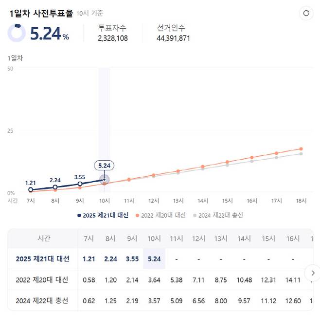 지난 20대 대선 사전투표율은 첫날 오전 10시 기준 3.64%였고, 지난해 22대 총선 당시에는 3.57%였다.