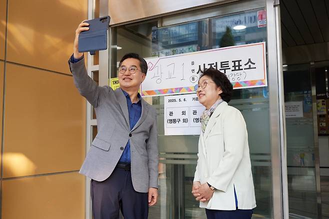 김동연 경기도지사가 29일 오전 7시경 부인 정우영 여사와 함께 수원 광교1동 행정복지센터에서 21대 대통령 선거 사전투표를 마치고 SNS에 인증샷(인증사진)을 올렸다.