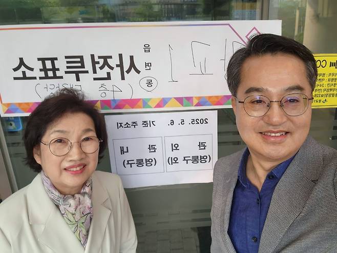 | ▲ 김동연 경기도지사가 29일 오전 7시경 부인 정우영 여사와 함께 수원 광교1동 행정복지센터에서 21대 대통령 선거 사전투표를 마치고 인증사진을 찍고 있다. |