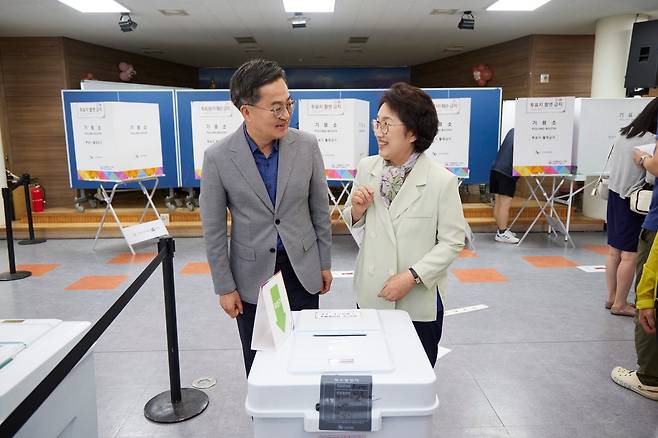 | ▲ 김동연 경기도지사가 29일 오전 7시경 부인 정우영 여사와 함께 수원 광교1동 행정복지센터에서 21대 대통령 선거 사전투표를 마쳤다. |