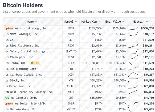해당 순위에선 비트코인 58만개를 가진 스트레티지가 압도적인 1위를 기록하고 있다.