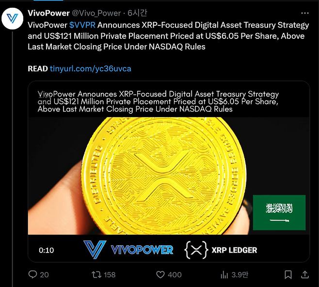 미국 나스닥 상장 에너지 솔루션 기업 비보파워가 XRP 중심의 디지털 자산 재무 전략을 발표했고 게임스톱 또한 4710개의 비트코인을 매수했다고 밝혔다.