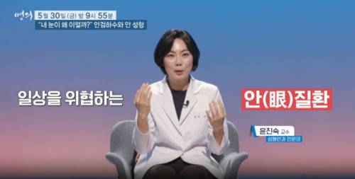 ▣EBS 명의(30밤 9:55)=눈은 우리의 삶의 모든 순간을 비추는 중요한 감각기관이다. 그런데 눈꺼풀이 내려와 시야를 가린다면, 눈물이 멈추지 않고 계속 흐른다면, 눈이 건조하고, 심지어 돌출까지 된다면! 안질환은 생명에 직접 위협을 가하는 질환은 아니지만 대수롭지 않게 넘긴다면 삶의 질이 굉장히 떨어질 수 있다. 또한 눈은 외적인 부분과도 연관되어 있어 기능과 동시에 미관까지 망가질 수 있다. 성형안과 윤진숙 교수와 함께 다양한 안질환과 성형안과 분야에 대해 알아본다.