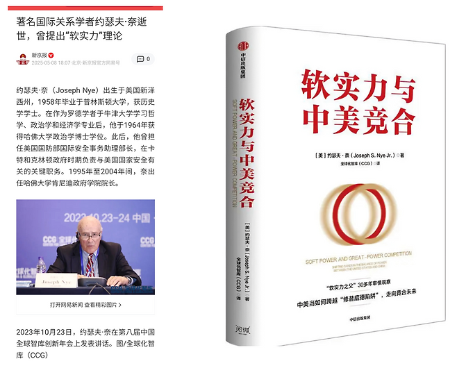 얼마 전 미국 한 정치학자의 부고가 중국 언론계와 학계에 반향을 불렀다. '소프트 파워(soft power)'라는 용어를 처음 쓴 인물로 우리에게도 잘 알려진 조지프 나이(Joseph Samuel Nye, Jr.)가 이달 초 88세를 일기로 별세했고, <신화통신>, <환구시보>를 비롯한 중국의 주류 언론들과 학자 및 지식인을 중심으로 한 SNS 매체들은 그의 과거 인터뷰를 실어 나르며 애도와 경의를 표했다. 중국에서는 과거 마오쩌둥 시기의 에드거 스노(Edgar Snow)를 비롯해 헨리 키신저(Henry Kissinger), 에즈라 보겔(Ezra Vogel) 등 중국에 관심을 가지고 연구한 서양 학자들을 '오랜 친구(老朋友)'라거나 우호 인사(友好人士)로 부르며 그들의 임종 소식에 국가 지도자들까지 나서 애도를 표하기도 했다.